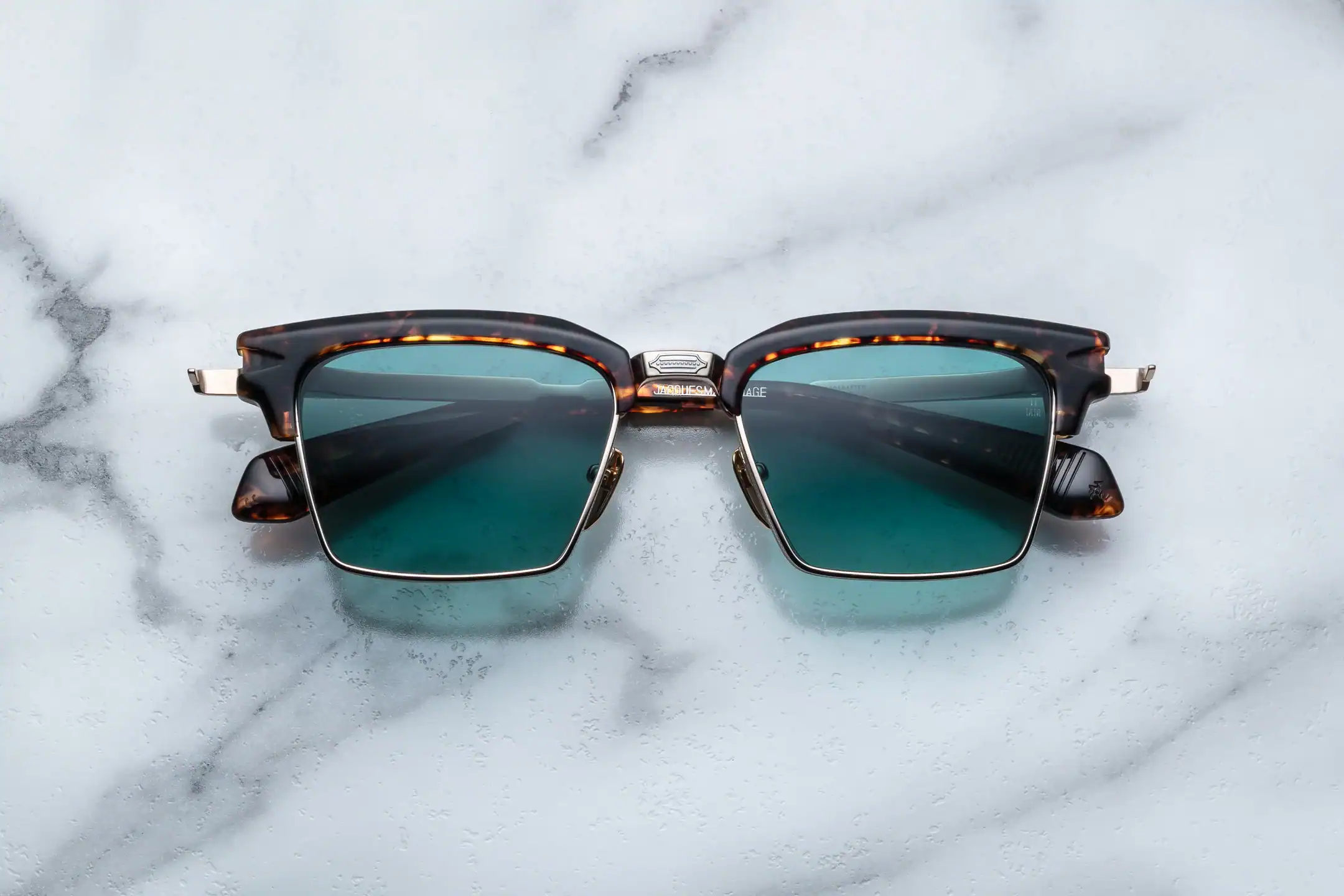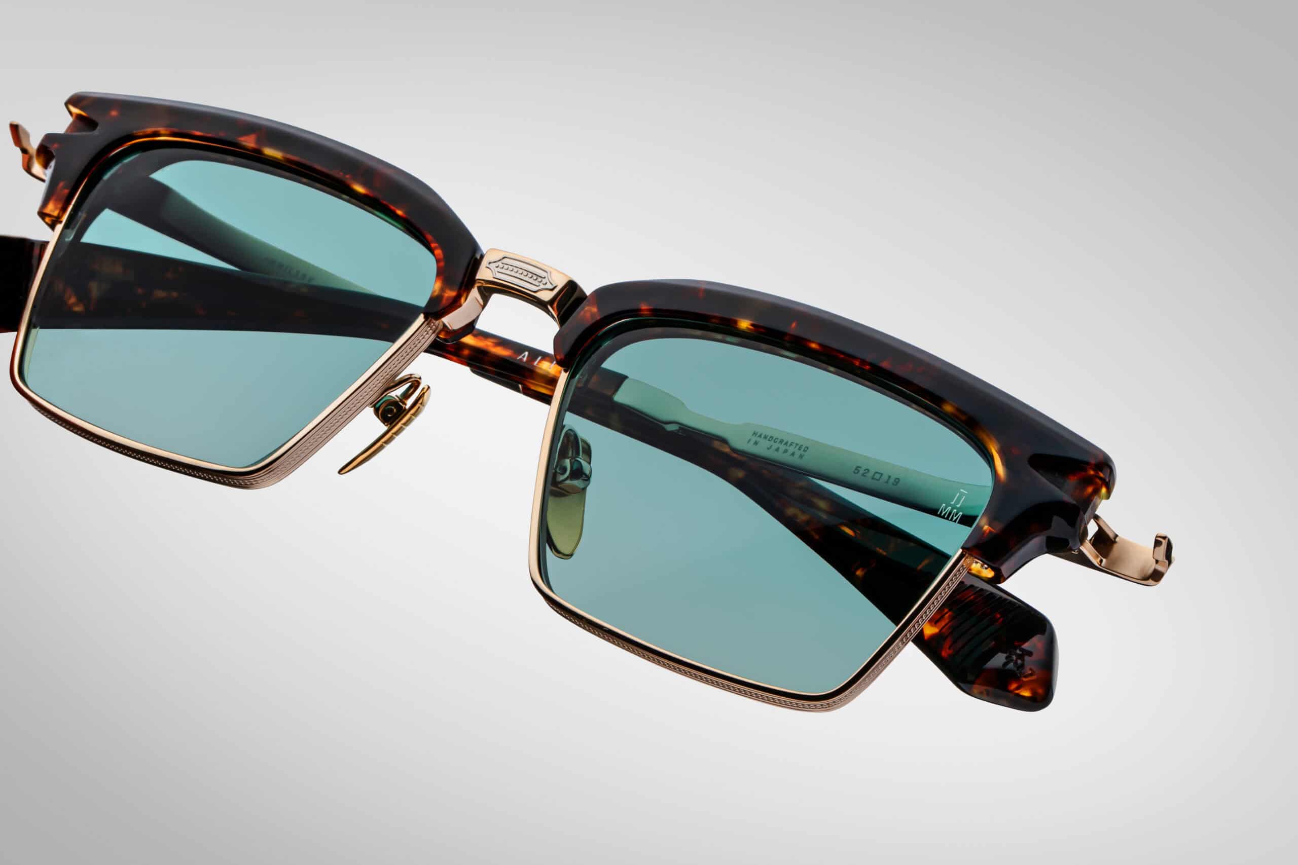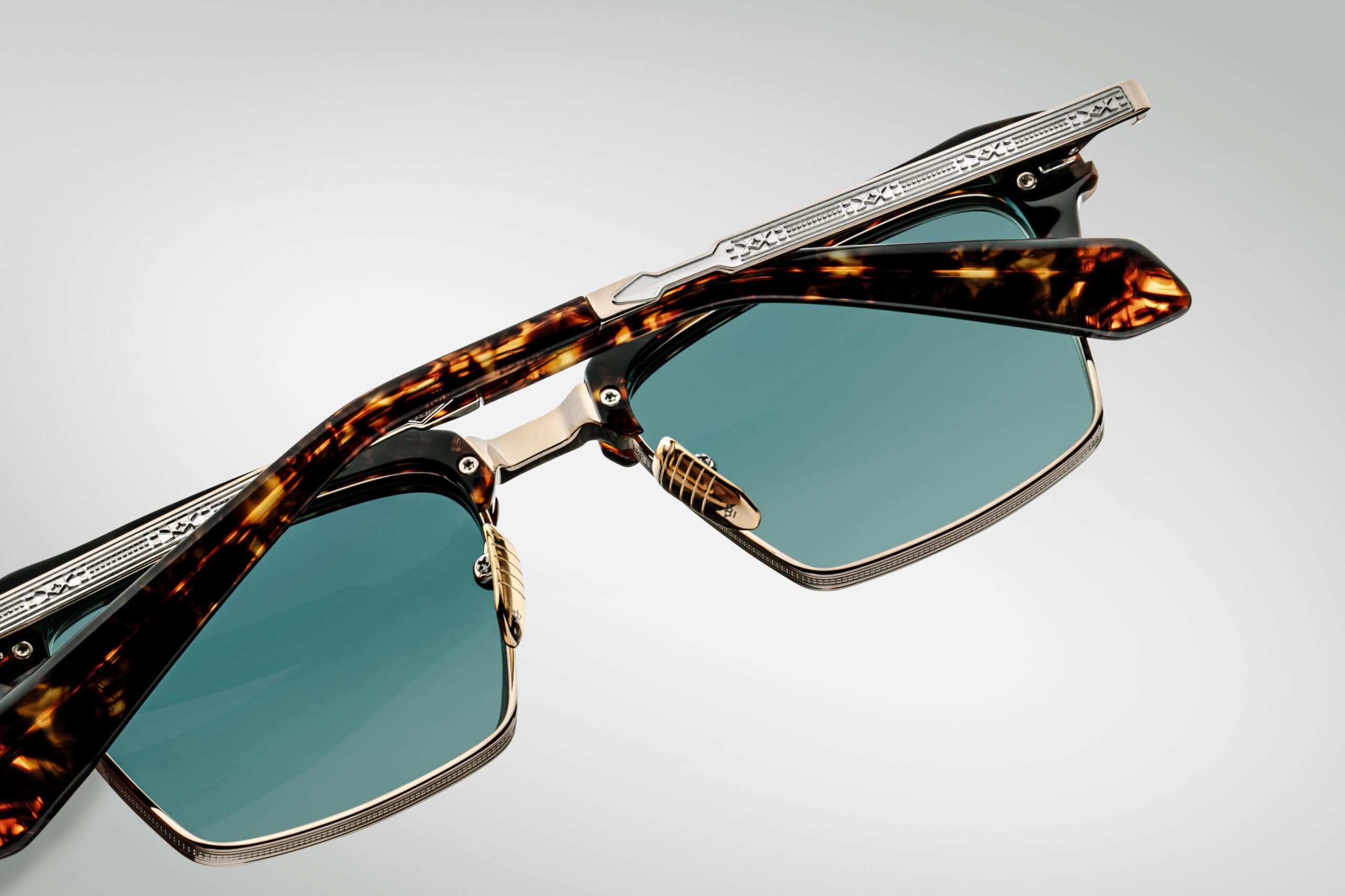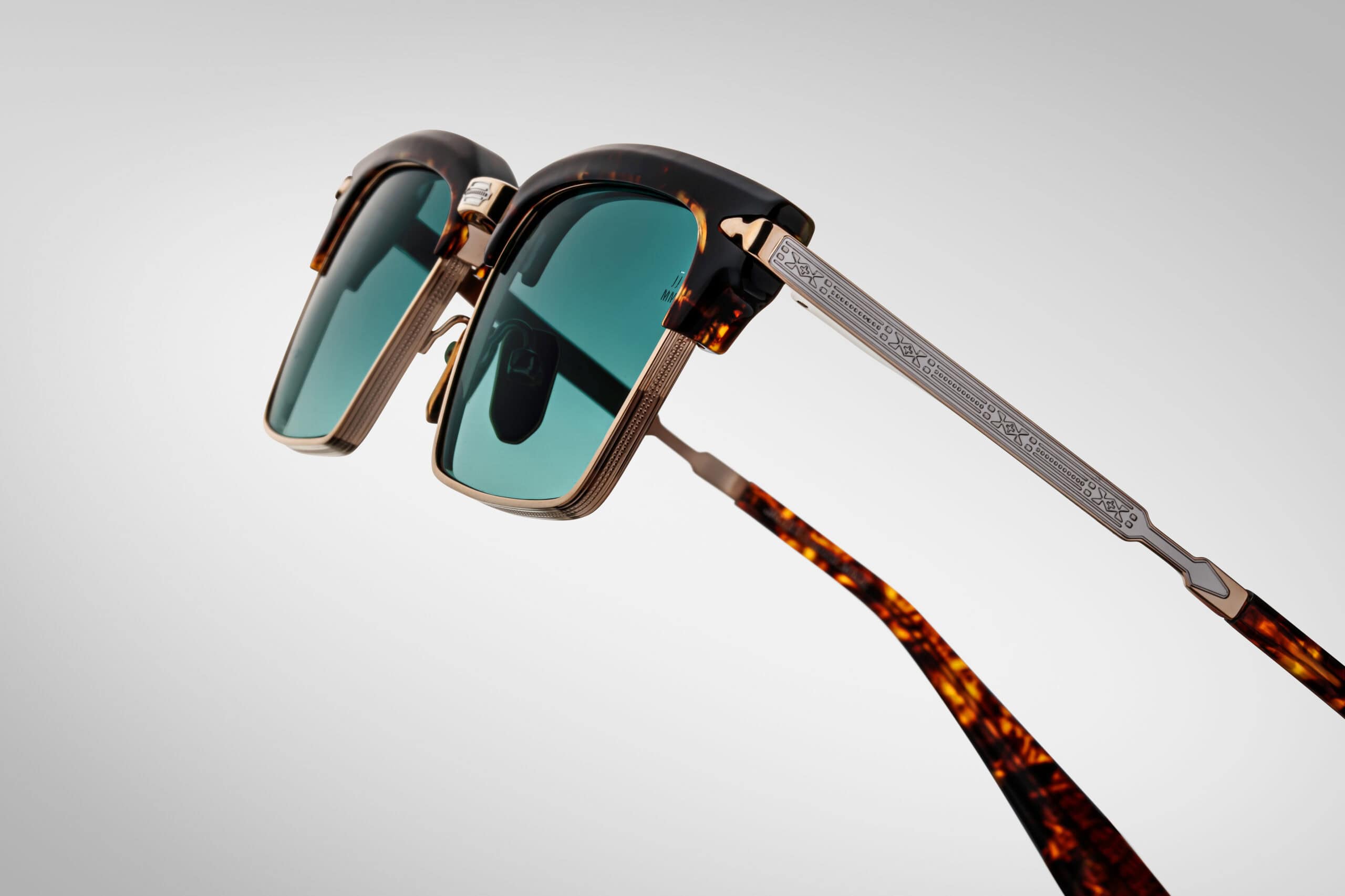 Characteristic eyebrow line in acetate in the colour Havana lends clarity to the setting, while Light gold titanium construction with silver accents emphasises its architectural elegance. The earcups are decorated with engraved design with arrow motif, and precise Arrowhead monoblock hinge combines solidity and subtlety of form. The whole is complemented by CR39 lenses in Dark Turquoise Gradient shade, which provide excellent protection and a deep, refined visual tone.