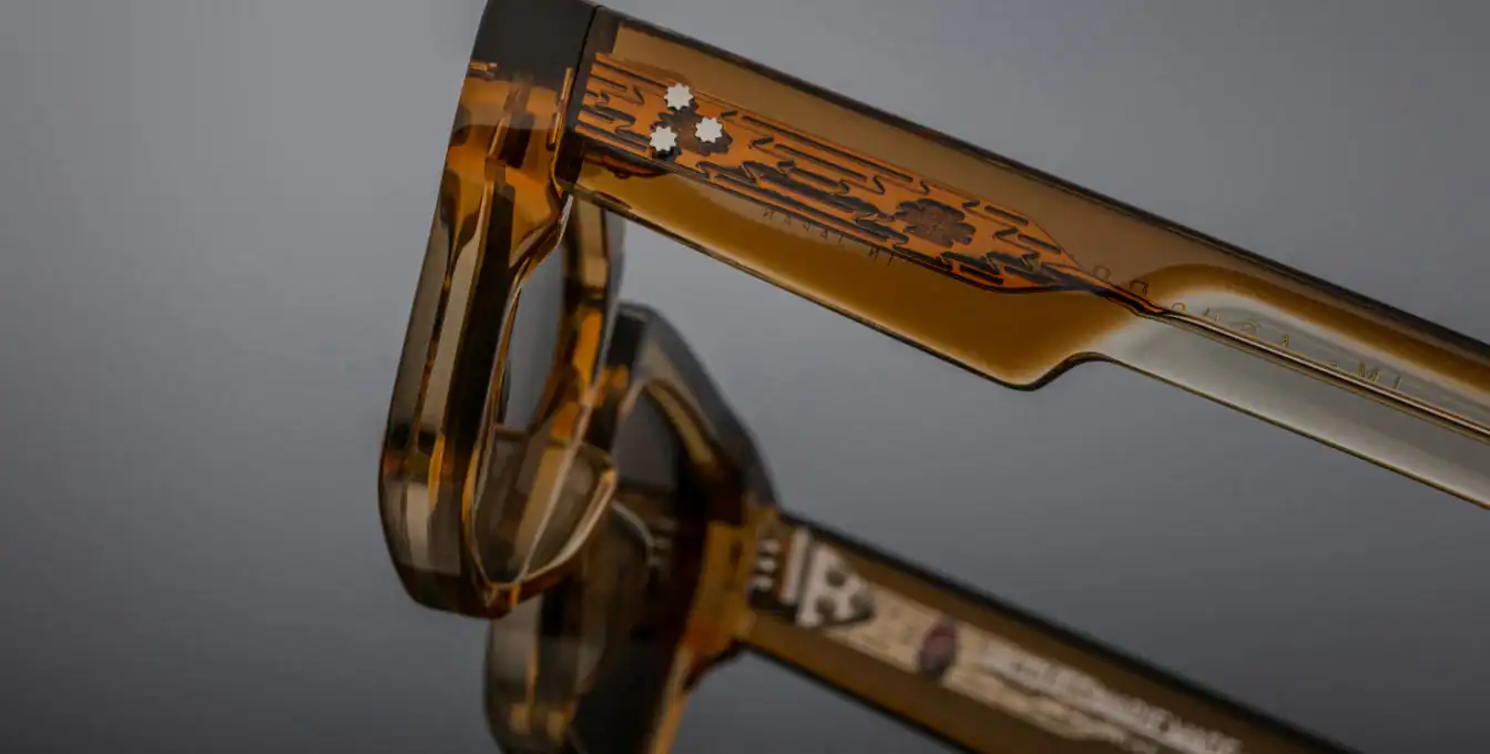 Rock character in luxury A rectangular frame with sharp lines and sculptural temples, in which the exposed core wire is decorated with artful patterns inspired by Native American art. It's a bold design that breaks the mould and emphasises individuality.